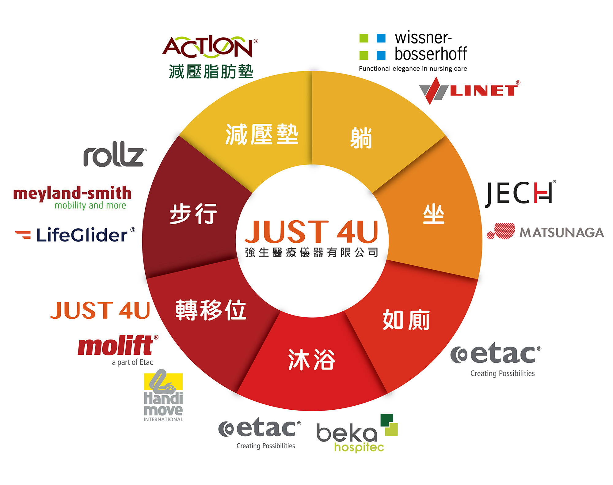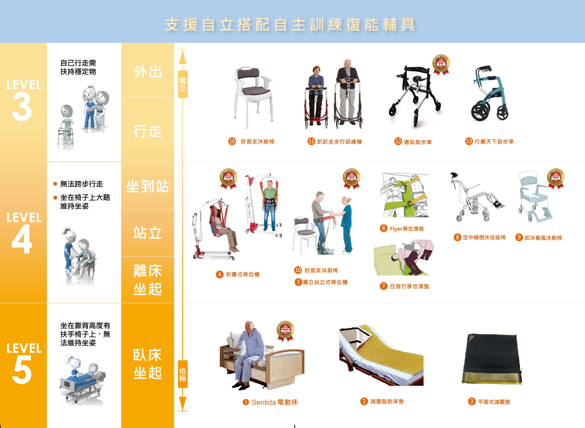 強生醫療以通用設計的觀念,為了讓用戶有更多生活上的便利,引進了七大種類的行動輔具產品,在依照用戶的行動能力分類成五種行動等級,來依照不同的行動能力,所需要的行動輔具如助步車助行器及步行訓練機等,讓用戶找到最適合自己,又不會花費冤枉錢的輔具產品。