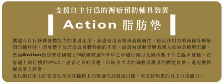 國ACTION脂肪墊除了有床上用、輪椅用,還有手術台、手肘、腳踝用等固定體位姿勢總有100種以上的產品還有各式各樣的尺寸。所有產品在購買前都能提供免費的試用品。