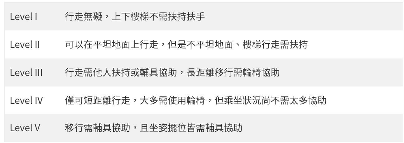 可依據GMFCS(Gross Motor Function Classification System)分級,大略歸類於: