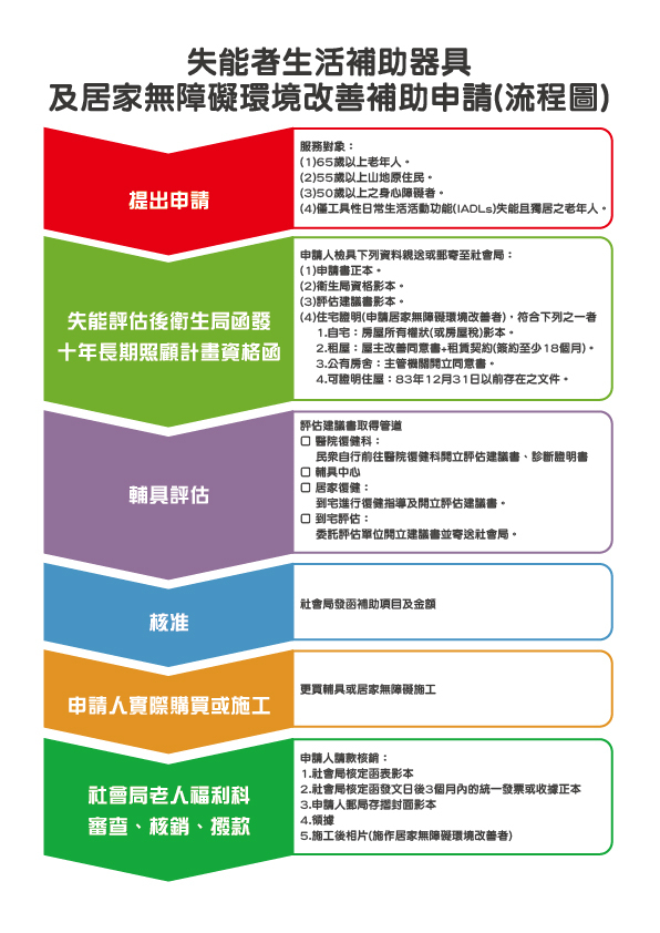 提出申請→失能評估後衛生局函發十年長期照顧計畫資格函→輔具評估→核准→申請人實際購買或施工→社會局老人福利科審查、核銷、撥款