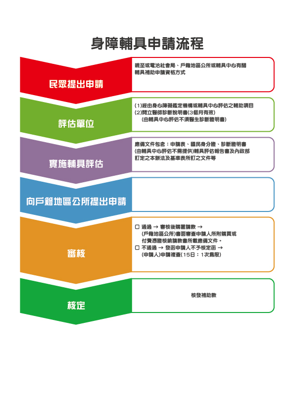 民眾提出申請→評估單位→實施輔具評估→向戶籍地區公所提出申請→審核→核定