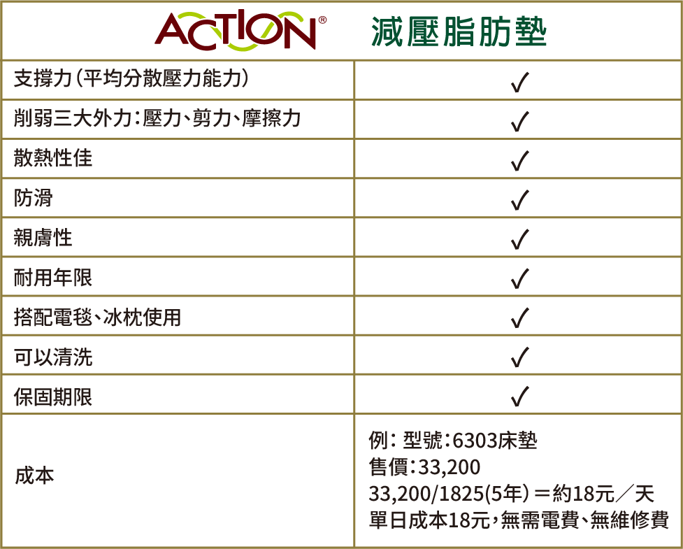 充分考慮到心愛的親人及看護者的負擔。Action"艾克森"減壓床墊具有分散局部壓力、減少剪力、及摩擦等基本功能外還具備有極高的安定性,