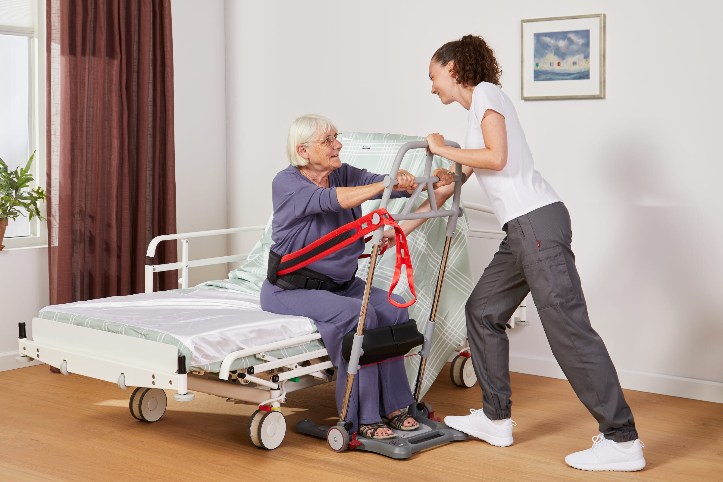 魔立站立式移位機/站立架 (Molift Raiser) 活動手腳架的設計協助使用者從坐姿站立起來,並且也提供在旁照顧的照護人員順利的協助處理這種狀況,幫助使用者順利移位。